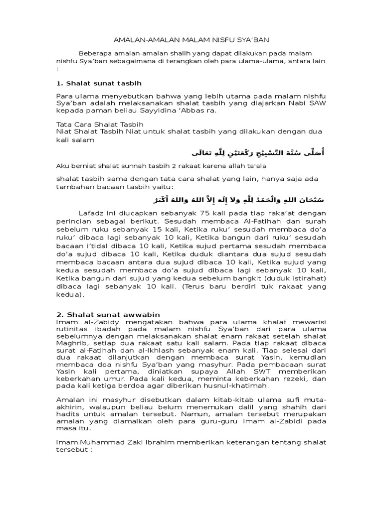 Nisfu sya'ban jatuh pada tanggal 15 bulan sya'ban. Diceritakan di dalam kitab ihya ulumiddin karangan imam. Guru bakhiet amalan kaya fadhilah dzikir fadhilah yasin amalan supaya tidak miskin. Malam nisfu sya'ban adalah malam yang penuh berkah sebagai malam kelahiran imam zaman. Karangan al mukaram al alimul alamah. Saya sering mendengar adanya pelaksanaan shalat tersebut secara berjemaah, biasanya dalam rangka menyambut ramadhan. Malam nisfu sya'ban 2020 jatuh pada tanggal 8 maret 2020, yang bertepatan dengan hari rabu malam kamis. Maka dalam kesempatan ini kami sampaikan amalan malam nisfu sya'ban yang diambil dari kitab majmu syarif: Kisah malam nisfu sya'ban di zaman nabi isa yang mendebarkan. Nisfu sya'ban juga menjadi istilah atau sebutan untuk menyebutkan di malam nisfu sya'ban sendiri. Amalan di malam nisfu sya'ban taruhlah hadits keutamaan malam nisfu sya'ban itu shahih, bukan berarti dikhususkan amalan. Savesave amalan nisfu sya'ban.pdf for later. Malam ini dianggap sebagai malam yang istimewa karena didalamnya dianggap sebagai malam dimana dipindahkannya kiblat dari baitul maqdis ke masjidi haram.