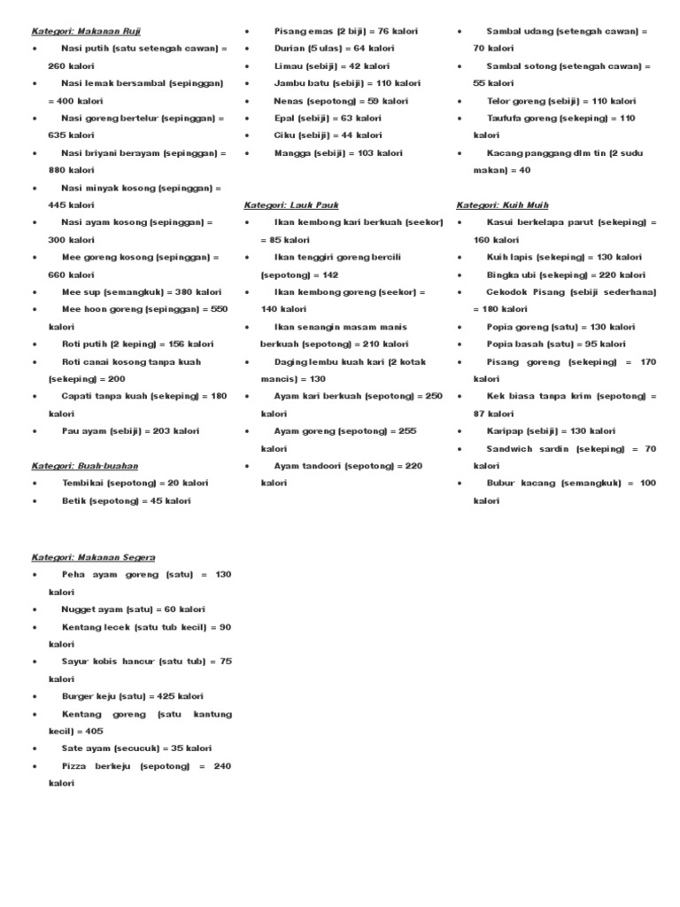 Kalori Nasi Lemak Ayam Telur from imgv2-1-f.scribdassets.com Makan nasi lemak setiap hari, tahu ke berapa jumlah kalori dalam sepinggan nasi lemak? Kalori nasi lemak juga adalah antara yang tertinggi berbanding jenis nasi yang lain. Untuk anda yang sedang berdiet mana yang lebih tinggi: Terdapat 204 kalori dalam nasi putih (1 mangkok,masak). Sepinggan = 880 kalori nasi claypot semangkuk = 898 kalori lauk pauk (kombinasi lauk seeloknya kurg dari 300 kalori) sayur campur goreng = 43 kalori ikan kembung gulai seekor = 85 kalorisambal. Nasi lemak bersambal (sepinggan) = 400 kalori 3. Ünlü ve amatör yazarlardan en güzel nilai kalori sepinggan nasi lemak kitapları incelemek ve satın almak için tıklayın. Ketahui kalori yang terkandung dalam makanan asasi rakyat malaysia.